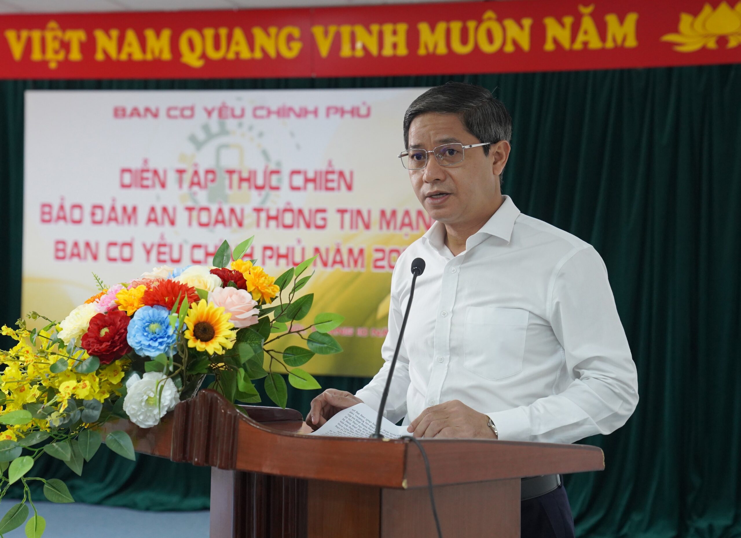 Đồng chí Nguyễn Hữu Hùng, Phó Trưởng ban Ban Cơ yếu Chính phủ phát biểu tại buổi khai mạc diễn tập