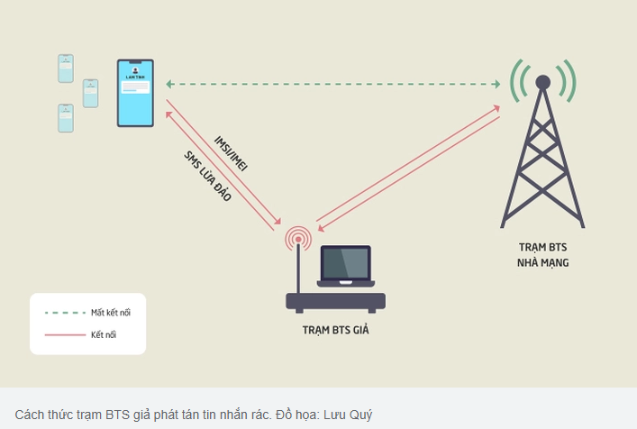 Cách thức trạm BTS giả phát tán tin nhắn rác. Đồ họa: Lưu Quý