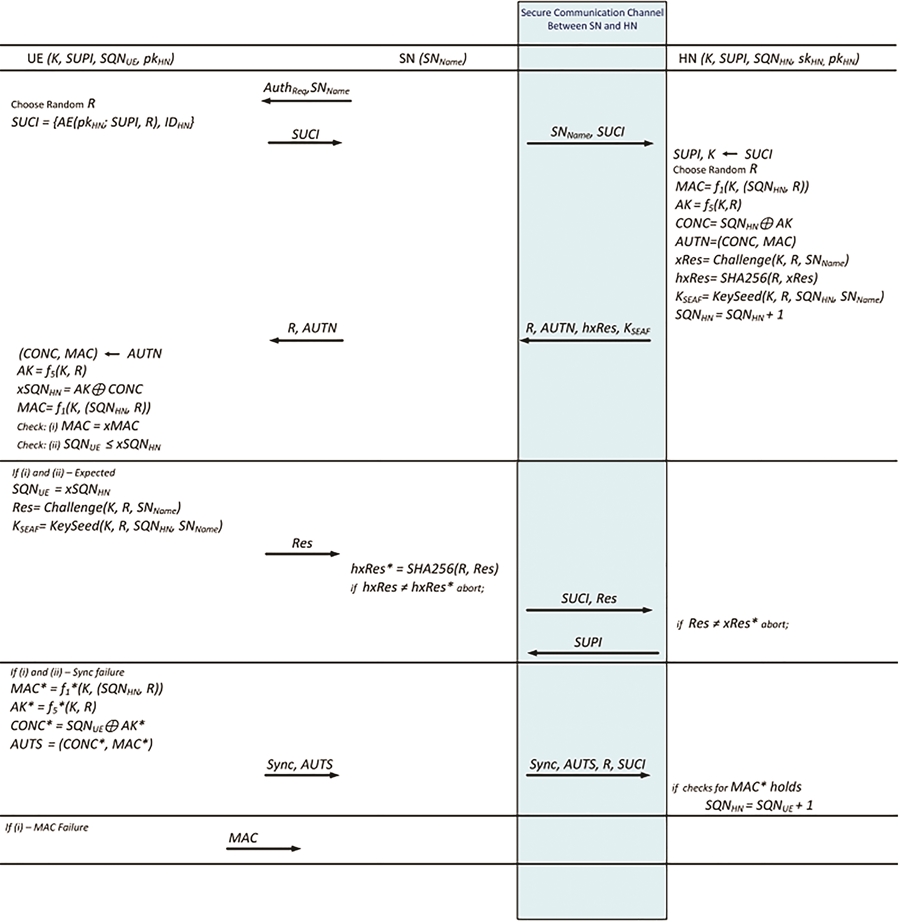 Các hành động do HN thực hiện Sau khi kiểm tra các khả năng, HN dẫn xuất một tham số mới ký hiệu là O, dựa vào đầu vào của tham số ngẫu nhiên R1 và R2, đã xác định tương ứng bởi UE và SN. Mục đích gửi xác nhận tới UE về giá trị của SN, HN dẫn xuất. Tiếp theo, HN dẫn xuất hai tham số khác là xRes, hxRes, hai tham số này về sau UE sẽ sử dụng trong giao thức để chứng minh với SN rằng UE là người dùng hợp pháp. Điều này xuất phát từ thực tế UE là người dùng duy nhất có thể tính xRes và bằng cách chia sẻ hxRes (giá trị băm trên xRes) với SN. Cuối cùng, khóa phiên KSEAF được dẫn xuất, dựa vào đầu vào chỉ được biết bởi UE. HN gửi khóa phiên KSEAF và SUPI, giá trị này đã được mã hóa trong thông báo EK bằng tham số xRes. Do đó, UE có quyền kích hoạt khóa phiên và tiết lộ danh tính của nó tới SN sau này trong trường hợp xác thực thành công. Kết quả là thông báo xMAC, hxRes, EK được gửi tới SN, SN chuyển tiếp xMAC tới UE.