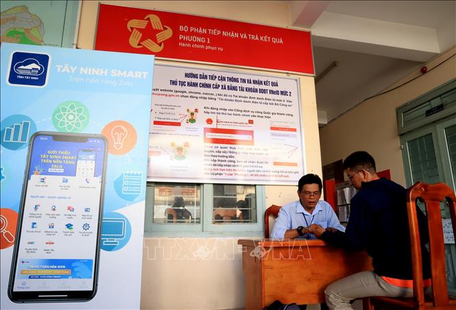Cán bộ UBND Phường 1 (thành phố Tây Ninh, tỉnh Tây Ninh) hướng dẫn người dân sử dụng tài khoản dịch vụ công quốc gia. (Ảnh: TTXVN).