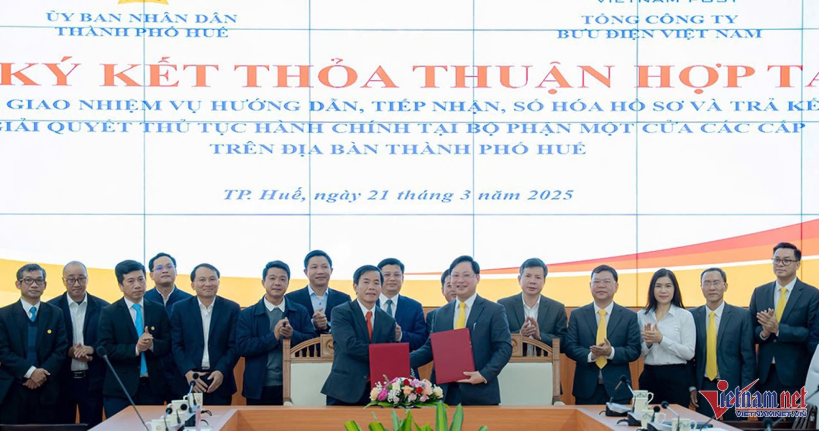Ngày 21/03/2025, UBND TP Huế, Tổng Công ty Bưu điện Việt Nam (Vietnam Post) đã ký kết Thỏa thuận hợp tác chuyển giao nhiệm vụ hướng dẫn, tiếp nhận, số hóa hồ sơ và trả kết quả giải quyết thủ tục hành chính tại bộ phận một cửa các cấp trên địa bàn TP Huế.