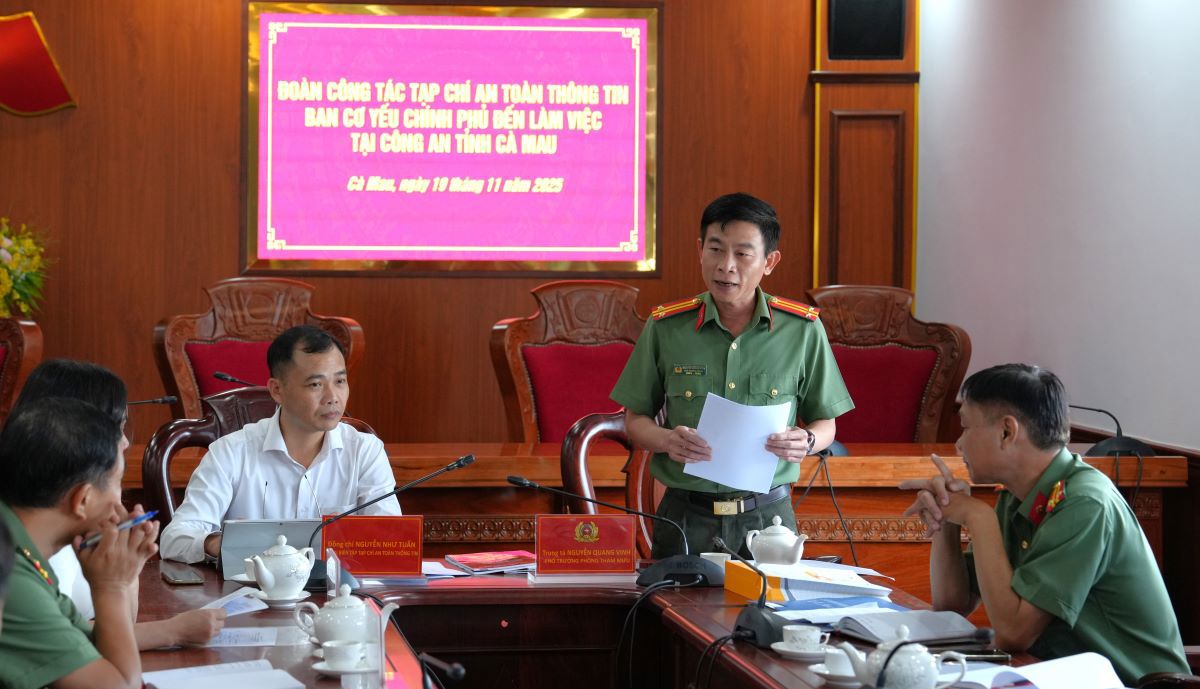 Phát biểu tại buổi làm việc, đồng chí Nguyễn Như Tuấn, Tổng Biên tập Tạp chí An toàn thông tin chia sẻ rằng: “Qua chuyến công tác thực tế lần này, chúng tôi cảm nhận rõ tinh thần quyết tâm của Công an tỉnh Cà Mau trong việc bảo đảm an toàn thông tin, phục vụ hiệu quả mọi hoạt động chỉ đạo và điều hành trên địa bàn tỉnh. Chúng tôi mong rằng trong thời gian tới, Công an tỉnh Cà Mau sẽ tiếp tục duy trì sự phối hợp chặt chẽ với Ban Cơ yếu Chính phủ và các cơ quan liên quan, cùng xây dựng một môi trường làm việc số an toàn, hiệu quả. Tạp chí An toàn thông tin sẽ tiếp tục đồng hành, phản ánh kịp thời những mô hình hay, kinh nghiệm tốt để lan tỏa những giá trị đó trong toàn ngành”.