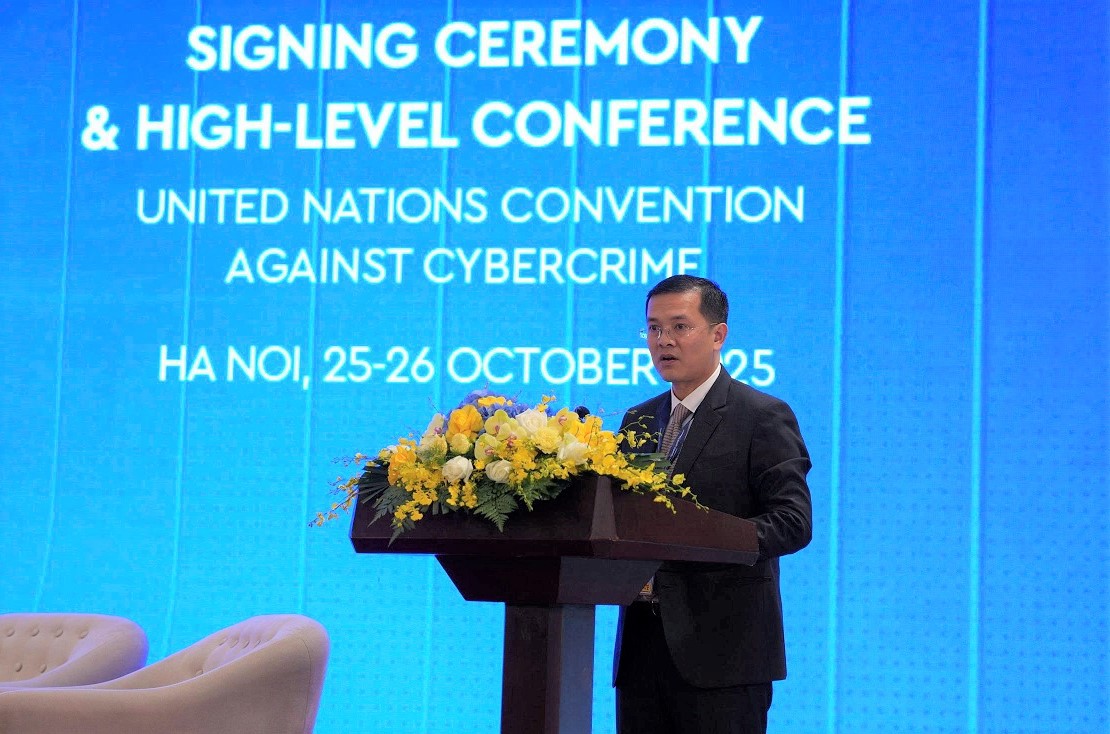 Đồng chí Phan Mạnh Cường, Phó Cục trưởng Cục Phòng, chống rửa tiền trình bày tham luận tại Lễ mở ký Công ước Liên Hợp quốc về chống tội phạm mạng