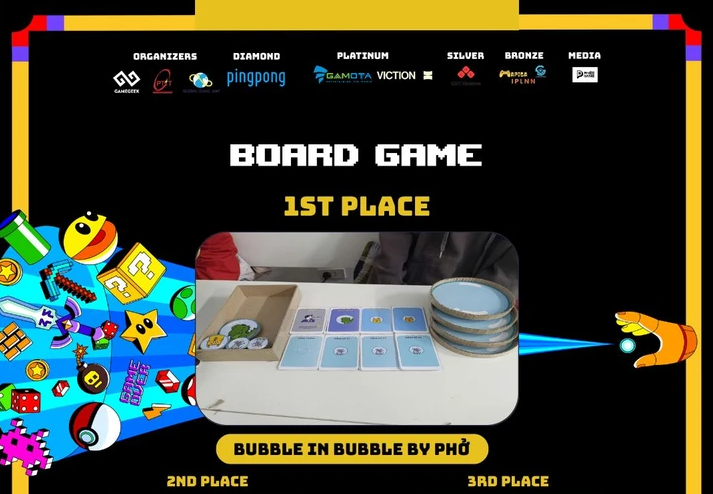 Ở hạng mục Hạng mục Board Game, sản phẩm Game “Bubbles in Bubble” của đội thi “Pho” gồm các sinh viên: Đoàn Thanh Tú- B24DCGA156 (Đội trưởng), Nguyễn Bảo Phú- B24DCGA112, Trần Quang Minh- B24DCGA100, Nguyễn Đình Cường Quốc- B24DCGA124. Bám sát với chủ đề của GameJam lần này là Bubble. Bubbles in Bubble tập trung miêu tả hình ảnh  nhiều bong bóng nhỏ được bơm vào một quả bong bóng lớn hơn đến khi dãn căng và vỡ ra. Hình ảnh này gắn liền với cách chơi của game là người chơi phải cố gắng làm sao cho quả bong bóng chứa của mình phát nổ cuối cùng thông qua việc bốc những lá bài “bong bóng” có kích thước, số lượng càng nhỏ càng tốt và đồng thời cho lừa những người chơi khác bốc được những bài “bong bóng ” càng lớn càng tốt. Được biết, đội sinh viên đạt giải Nhất hạng mục Board Game là các sinh viên năm nhất của chương trình Thiết kế và Phát triển Game vừa được Học viện tuyển sinh lứa đầu tiên trong năm 2024.
