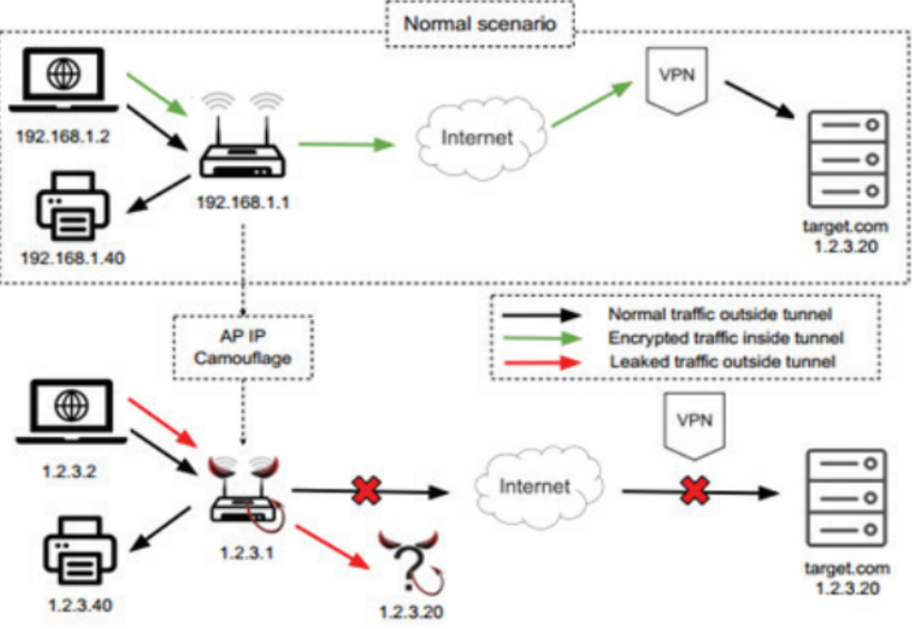 Kịch bản tấn công này được minh họa bằng ví dụ trong Hình 1. Thông thường, mạng nội bộ sẽ sử dụng dải địa chỉ IP riêng như 192.168.1.0/24. Nếu người dùng trong mạng này cố gắng truy cập máy chủ web có địa chỉ IP 1.2.3.20 thì đường hầm VPN sẽ được sử dụng. Tuy nhiên, nếu AP sử dụng dải địa chỉ IP 1.2.3.0/24 cho mạng nội bộ thì địa chỉ IP của máy chủ mục tiêu nằm trong mạng nội bộ này. Do đó, máy khách VPN của nạn nhân sẽ tin rằng máy chủ web đang cố gắng kết nối nằm trong cùng một mạng nội bộ với chính nó. Kết quả là máy khách sẽ cố gắng kết nối trực tiếp với máy chủ web mà không cần sử dụng đường hầm VPN.