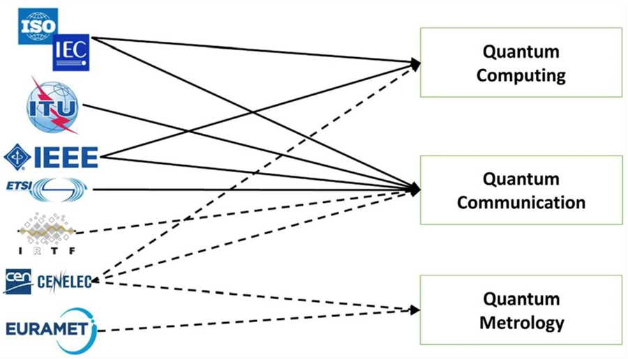 Hình 1: Các hoạt động tiêu chuẩn hóa về công nghệ lượng tử. Đường liền nét: phát triển tiêu chuẩn. Đường đứt nét: các hoạt động tiêu chuẩn hóa