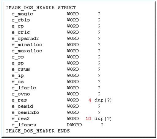 Tất cả các file PE bắt đầu bằng DOS Header, vùng này chiếm 64 bytes đầu tiên của files. Vùng này được dùng  trong trường hợp chương trình chạy trên nền DOS, hệ điều hành DOS nhận biết đây là một file thực thi hợp lệ và sẽ thực thi nội dung trong phần DOS stub. DOS Header là một cấu trúc được định nghĩa trong file windows.inc hoặc winnt.h. Cấu trúc này gồm 19 thành phần.
