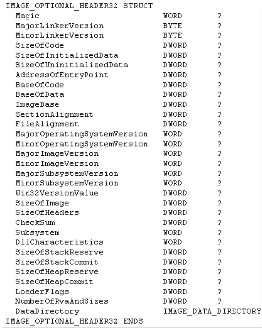 • OptionalHeader: bao gồm 224 bytes tiếp theo sau FileHeader. Cấu trúc này được định nghĩa trong windows.inc, đây là phần chứa thông tin về sơ đồ logic trong PE file. Dưới đây là danh sách các trường trong cấu trúc này, đồng thời sẽ đưa ra một số chỉ dẫn về thông tin của một số trường cần quan tâm khi muốn chỉnh sửa file.