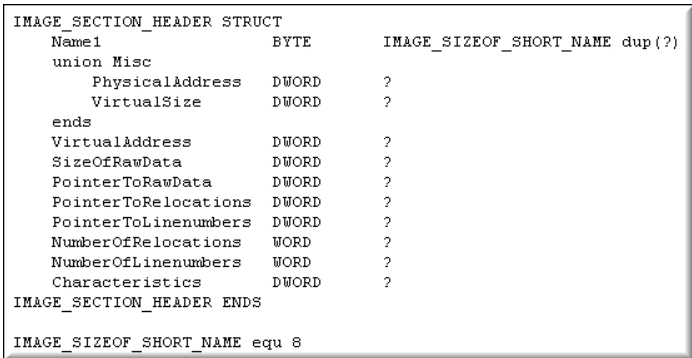 Section Table là thành phần ngày sau PE Header, bao gồm một mảng những cấu trúc IMAGE_SECTION_HEADER, mỗi phần tử chứa thông tin về một section trong PE file. Cấu trúc này được định nghĩa trong file windows.inc như hình dưới đây: