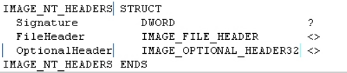 PE Header thực chất là cấu trúc IMAGE_NT_HEADERS bao gồm các thông tin cần thiết cho quá trình loader load file lên bộ nhớ. Cấu trúc này gồm 3 phần được định nghĩa trong windows.inc
